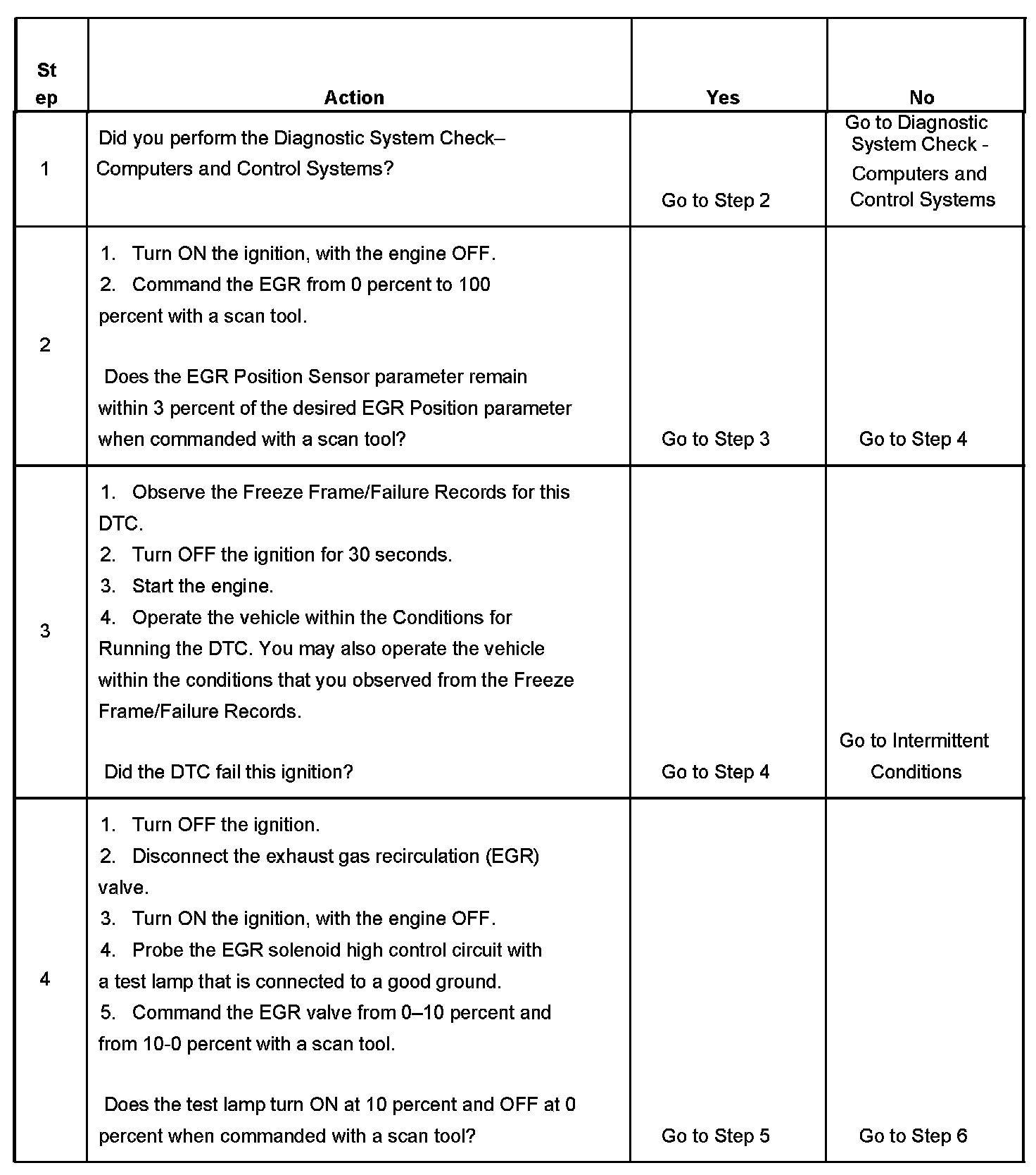 The powertrain control module (PCM) controls the exhaust gas recirculation (EGR) valve with a solid state device called a driver. The driver supplies the EGR solenoid with 12 volts that is pulse width modulated (PWM) through the EGR solenoid high control circuit. A ground path is provided by the PCM through the EGR solenoid low control circuit. The driver has the ability to detect an electrical malfunction on the EGR solenoid control circuits. If the PCM determines that the driver has detected an electrical malfunction on one of these circuits, DTC P0403 sets.