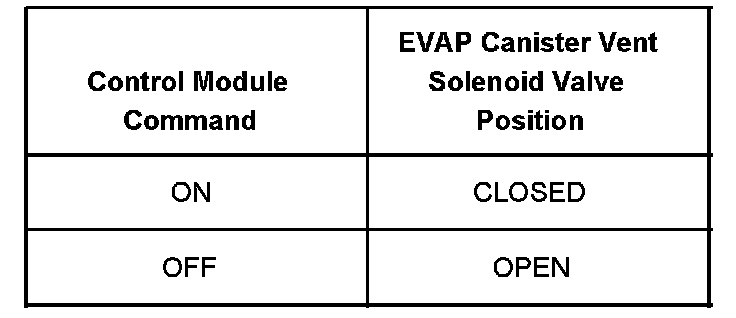 The table illustrates the relationship between the ON and OFF states, and the OPEN or CLOSED states of the EVAP canister vent solenoid valve.