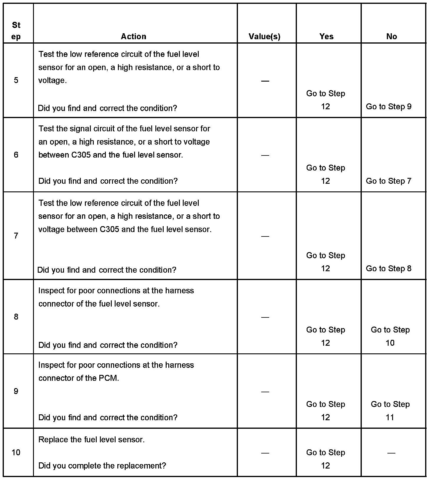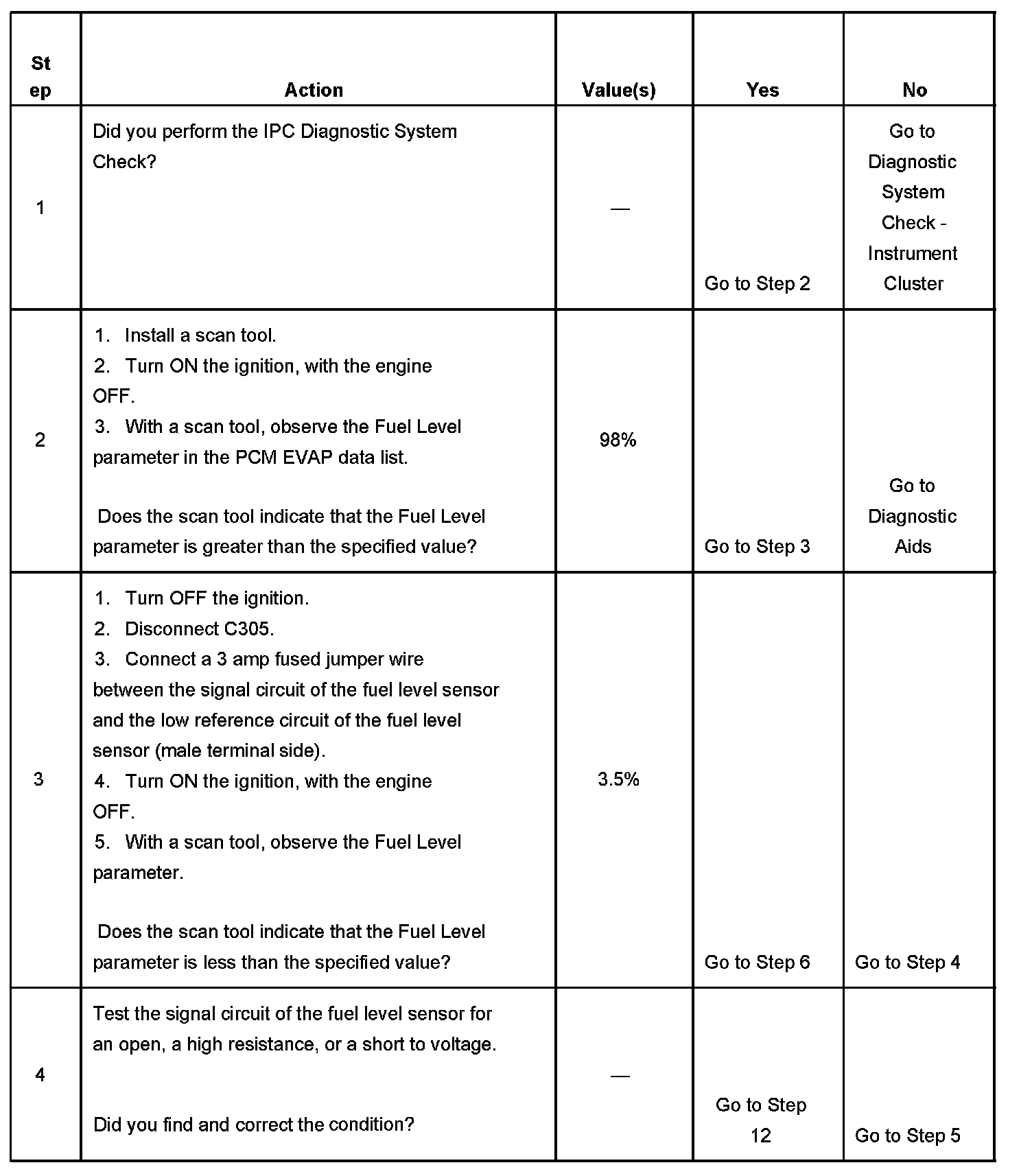 The fuel level sensor changes resistance based on fuel level. The PCM monitors the signal circuit of the fuel level sensor in order to determine fuel level. When the fuel tank is full, the sensor resistance is high and the PCM senses a high signal voltage. When the fuel tank is empty, the sensor resistance is low and the PCM senses a low signal voltage. The PCM uses the signal circuit of the fuel level sensor in order to calculate the total remaining fuel (%) in the tank. The PCM sends the fuel level percent via the class 2 serial data circuit to the IPC in order to control the fuel gage. The fuel level information is also used for misfire and EVAP diagnostics.