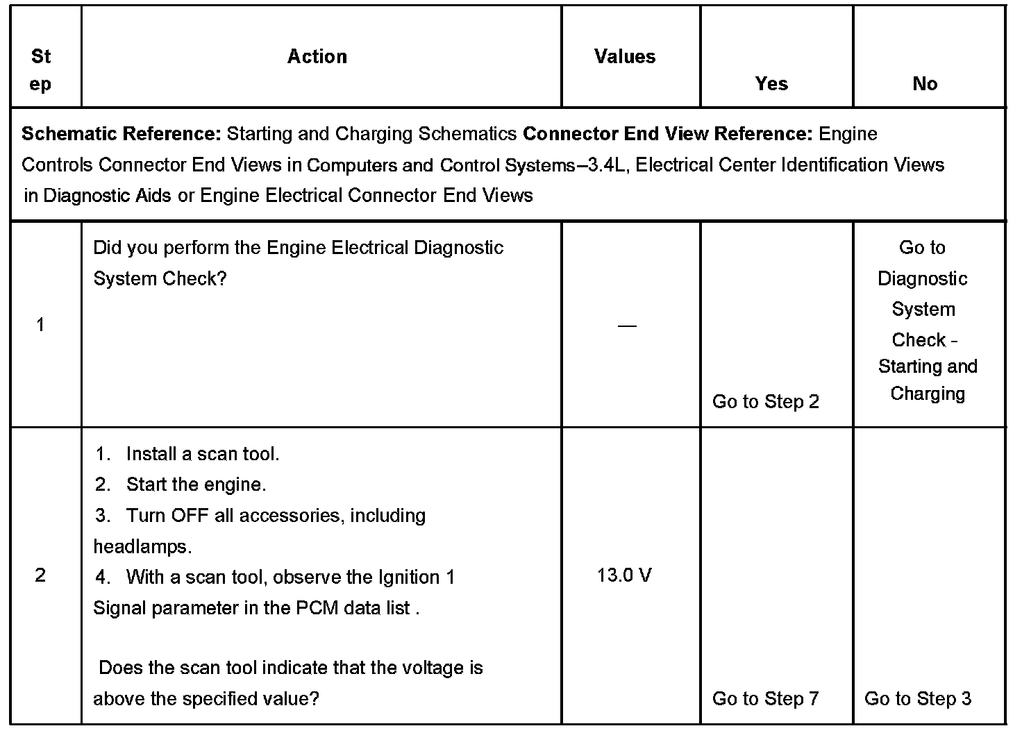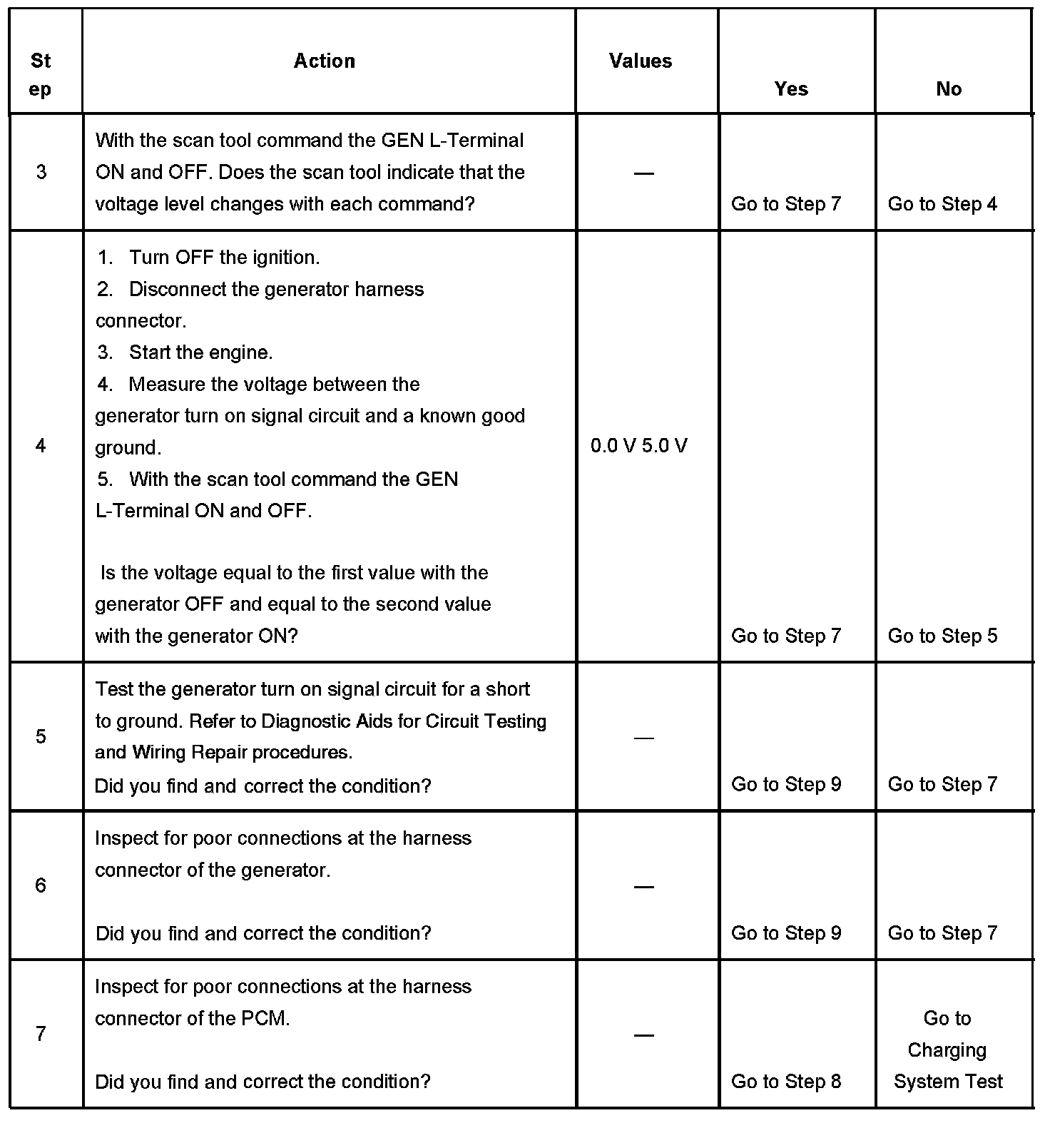 - The generator turn on signal circuit voltage is low while the PCM is commanding the generator on.