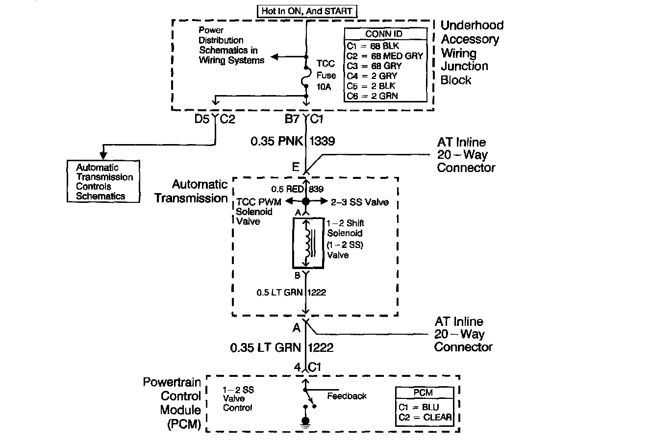 Ensure the wiring harness is not stretched too tightly or other components are pressing on the A/T Inline 20-way connector body. Also inspect for proper clearance to any other components and wiring. Refer to Intermittent Conditions.