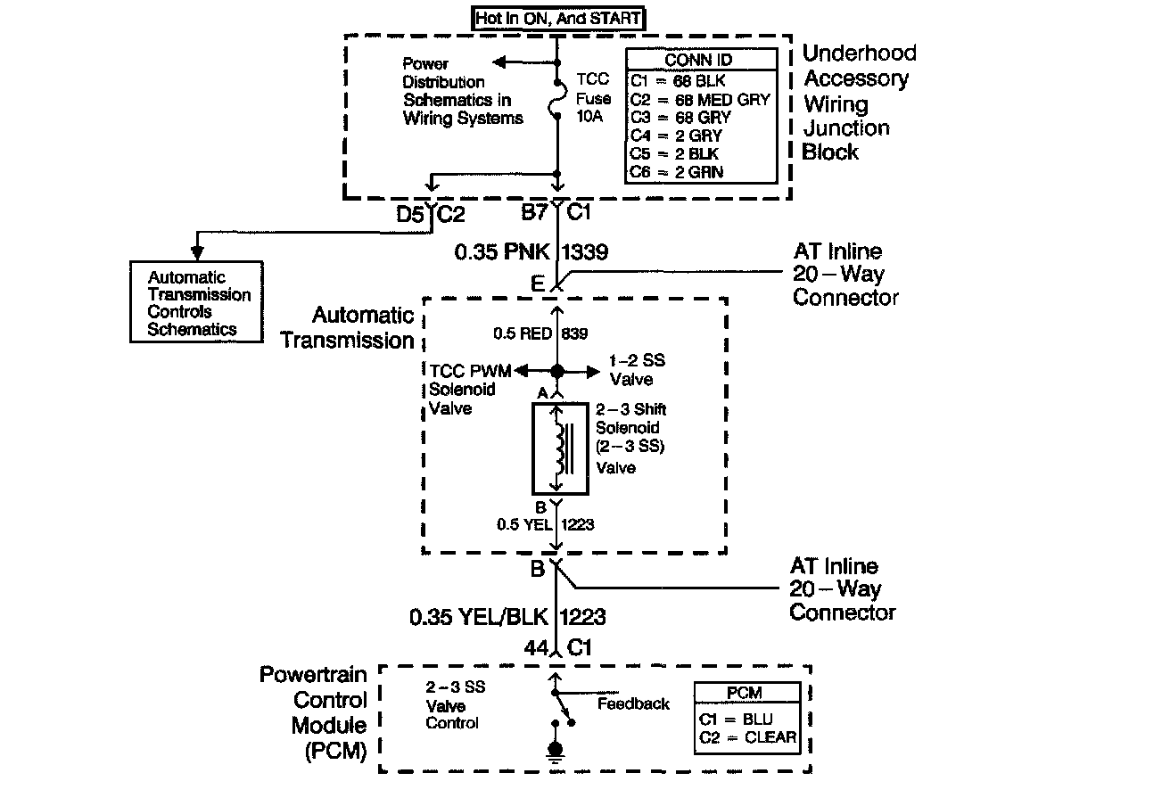 Ensure the wiring harness is not stretched too tightly or other components are pressing on the A/T inline 20-way connector body. Also inspect for proper clearance to any other components and wiring. Refer to Intermittent Conditions.