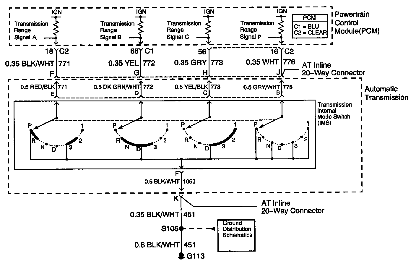 The transmission Internal Mode Switch (IMS) is a sliding contact switch attached to the selector detent inside the transmission side cover. The four inputs to the PCM indicate the position of the transmission range selector. The input voltage level at the PCM is high, B+, when the IMS is open and low when the switch is closed to ground. The four input parameters represented are Signals A, B, C and P - Parity. Refer to Transmission Internal Mode Switch Logic.