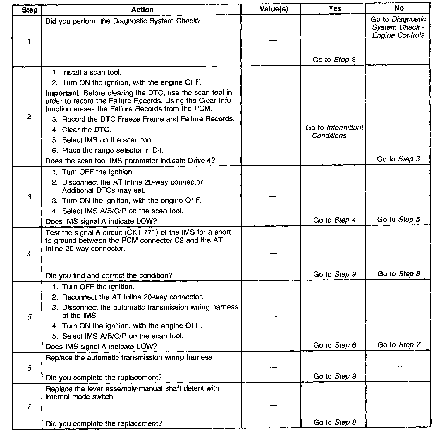 5. This step tests the internal transmission harness. A value of LOW for Signal A indicates the fault is in the harness. Otherwise the fault will be in the switch.