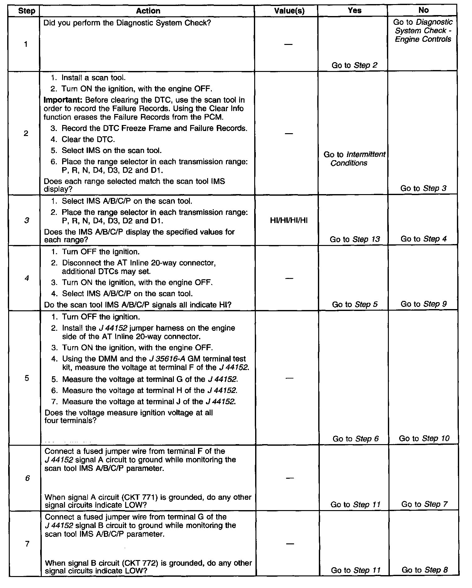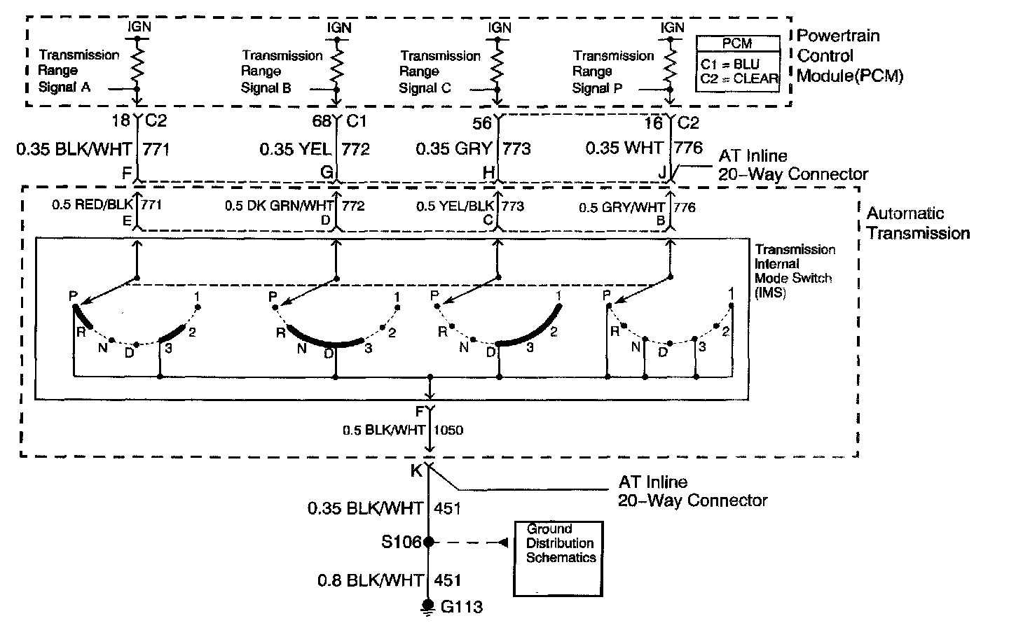 The transmission Internal Mode Switch (IMS) is a sliding contact switch attached to the selector detent inside the transmission side cover. The four inputs to the PCM indicate the position of the transmission range selector. The input voltage level at the PCM is high, B+, when the IMS is open and low when the switch is closed to ground. The four input parameters represented are Signals A, B, C and P - Parity. Refer to Transmission Internal Mode Switch Logic.