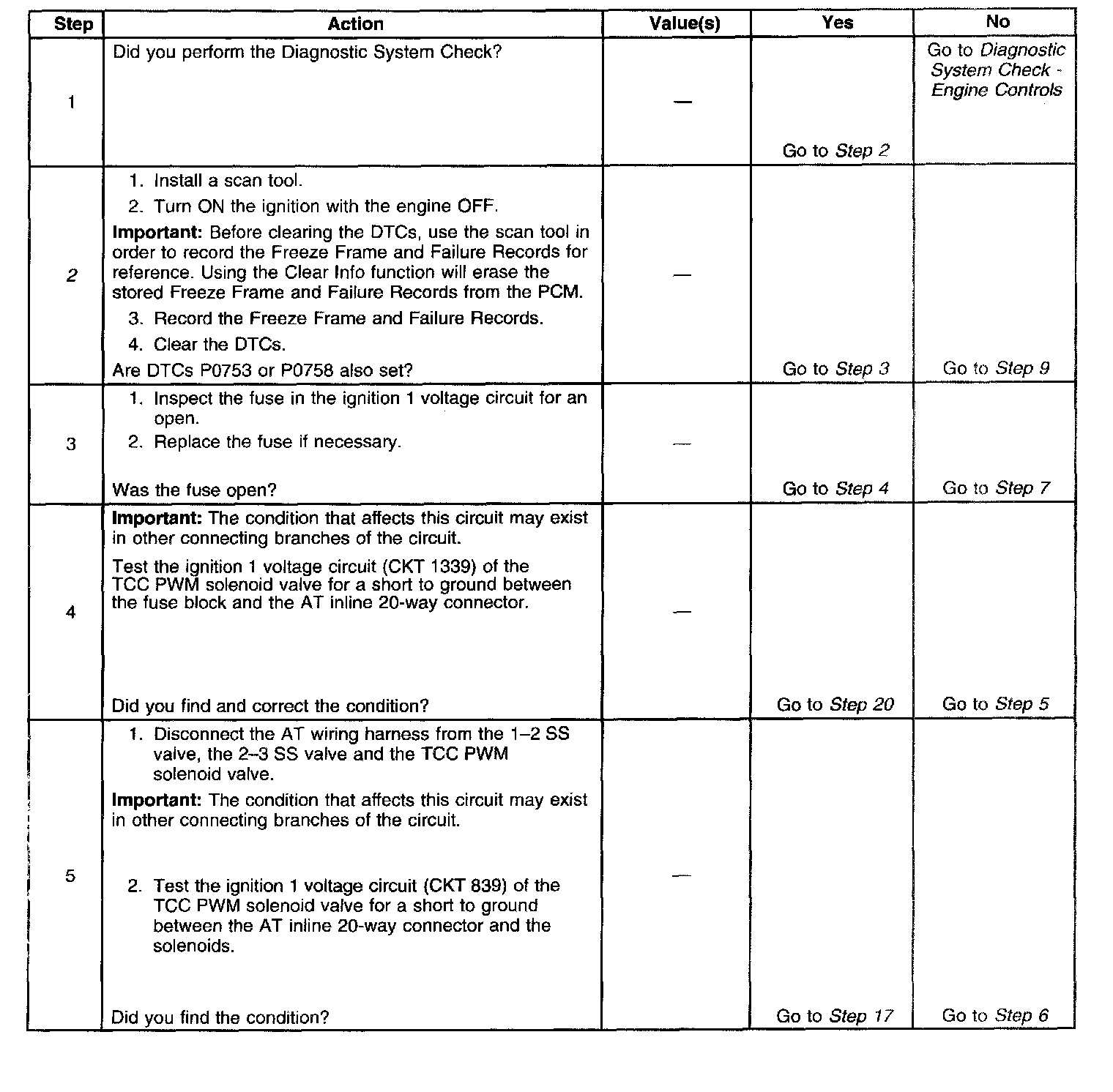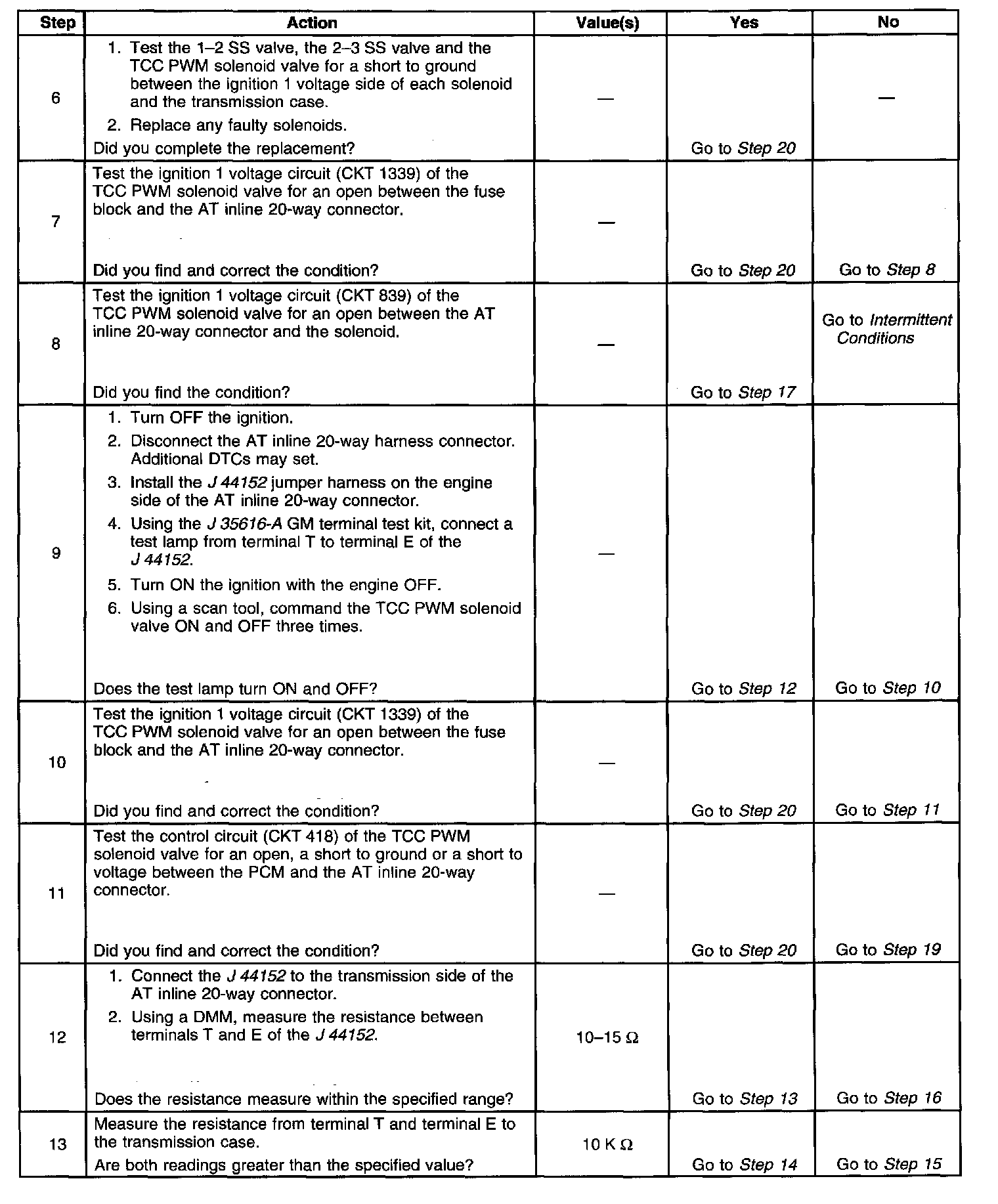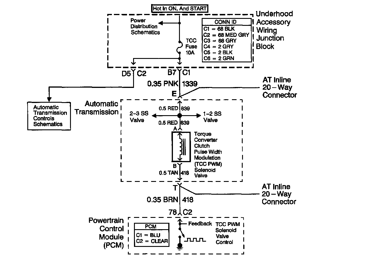 Ignition voltage is provided to the Torque Converter Clutch Pulse Width Modulation (TCC PWM) solenoid valve. The PCM controls the solenoid with a negative duty cycle in order to control application and release of the TCC. When the solenoid is commanded OFF, the PCM senses high voltage. When the solenoid is commanded ON, the PCM senses low voltage.