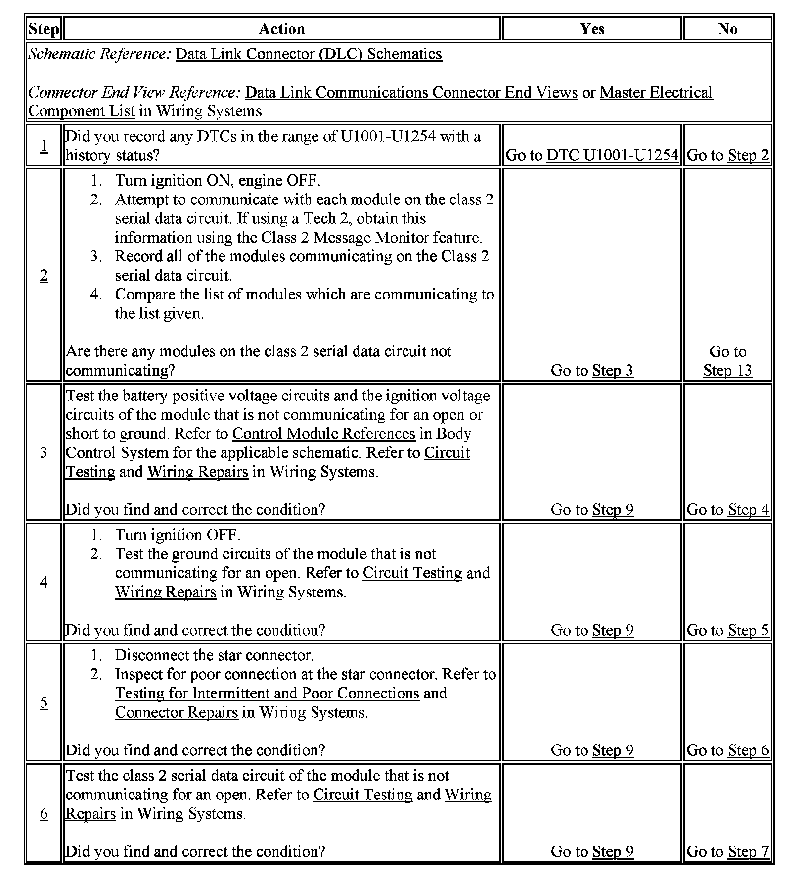 Modules connected to the class 2 serial data circuit monitor for serial data communications during normal vehicle operation. Operating information and commands are exchanged among the modules. When a module receives a message for a critical operating parameter, the module records the identification number of the module which sent the message for State of Health monitoring. A critical operating parameter is one which, when not received, requires that the module use a default value for that parameter. When a module does not associate an identification number with at least one critical parameter within about 5 seconds of beginning serial data communication, DTC U1000 or U1255 is set. When more than one critical parameter does not have an identification number associated with it, the DTC will only be reported once.