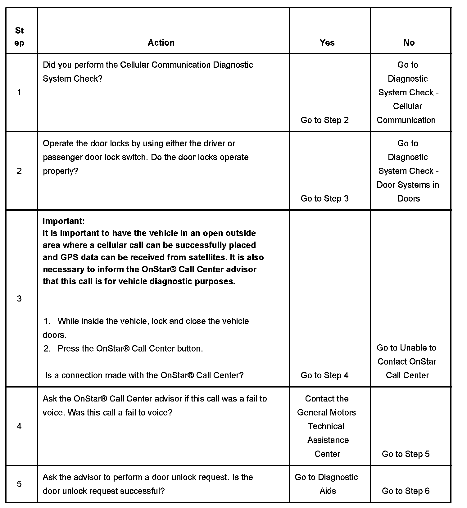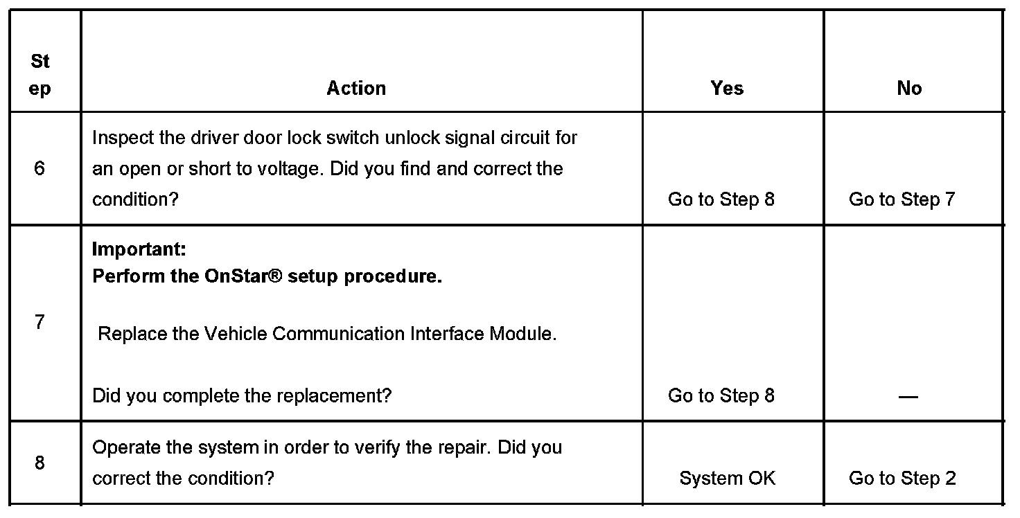 This vehicle uses a unique method of performing the door unlock feature when requested by the customer, to be performed by the OnStar(R) Call Center. A dedicated circuit from the Vehicle Communication Interface Module to the driver door lock switch unlock signal circuit at the Body Control Module is used for operating the remote door unlock feature.