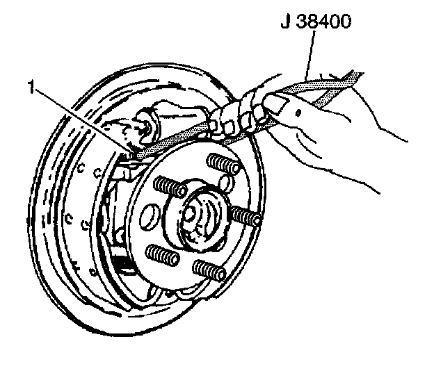 6. Use J 38400 to remove the universal spring from the brake shoes (1).