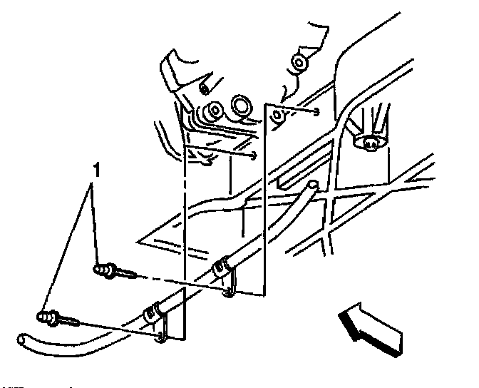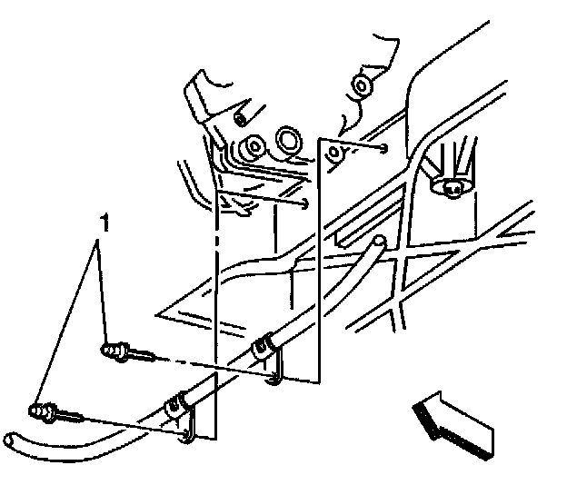5. Secure the park brake cable to the rear crossmember with two rivets (1).