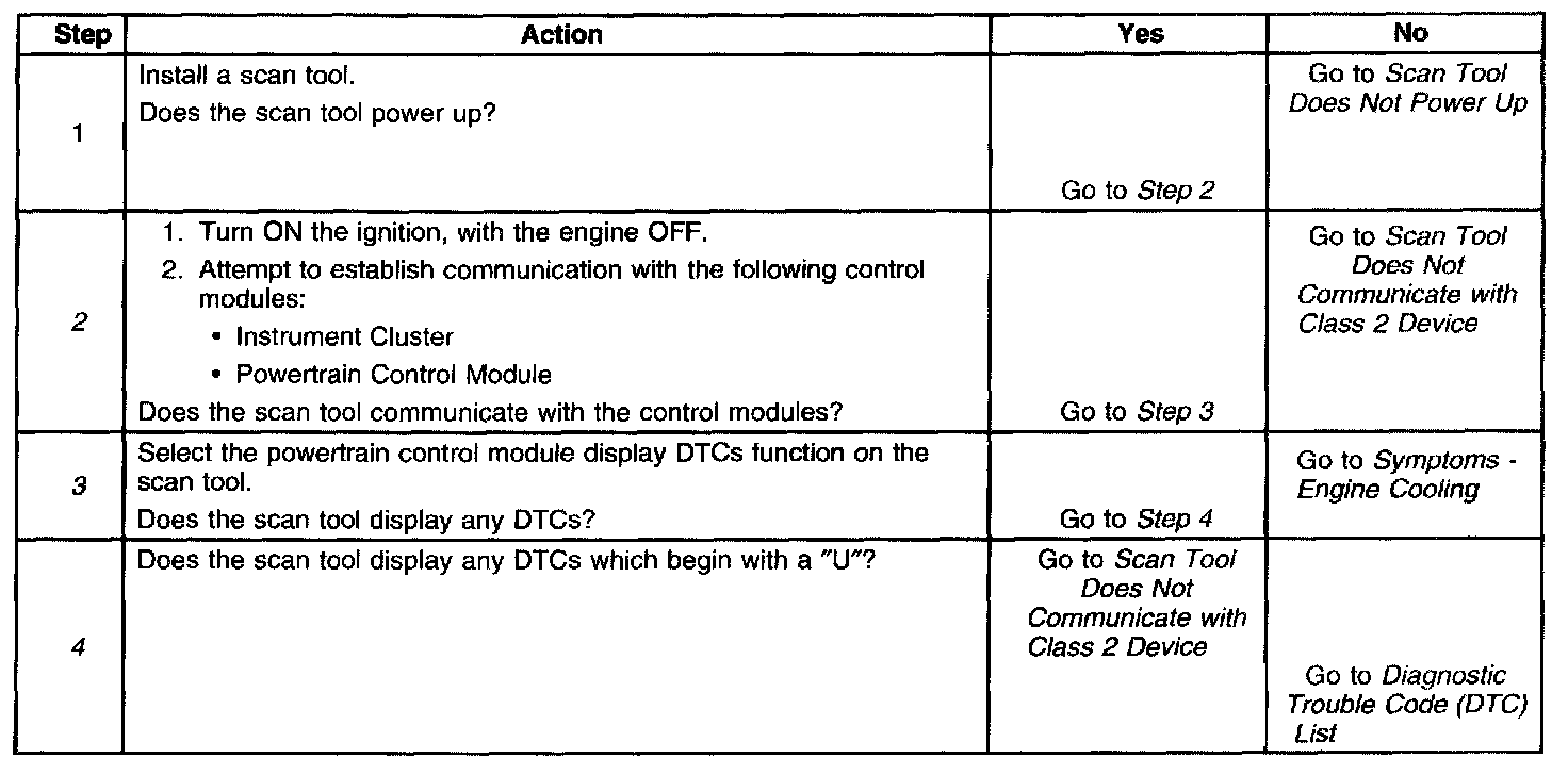 2. Lack of communication may be due to a partial malfunction of the class 2 serial data circuit or due to a total malfunction of the class 2 serial data circuit. The specified procedure will determine the particular condition.