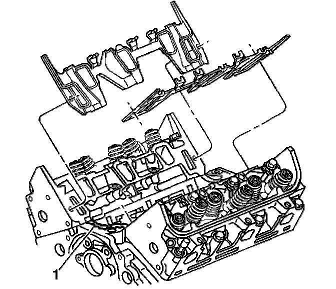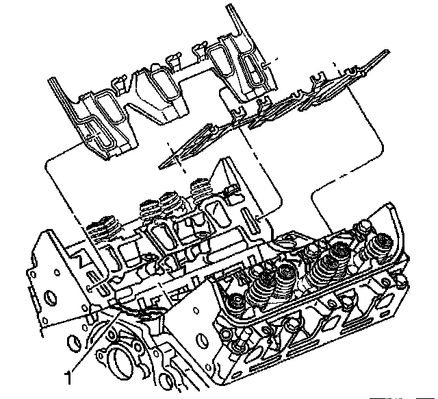 1. Apply 8 - 12 mm (0.08 - 0.11 inch) bead of RTV Sealer GM P/N 12345739 or equivalent on each ridge where front and rear of the lower intake manifold contact the engine block (1).