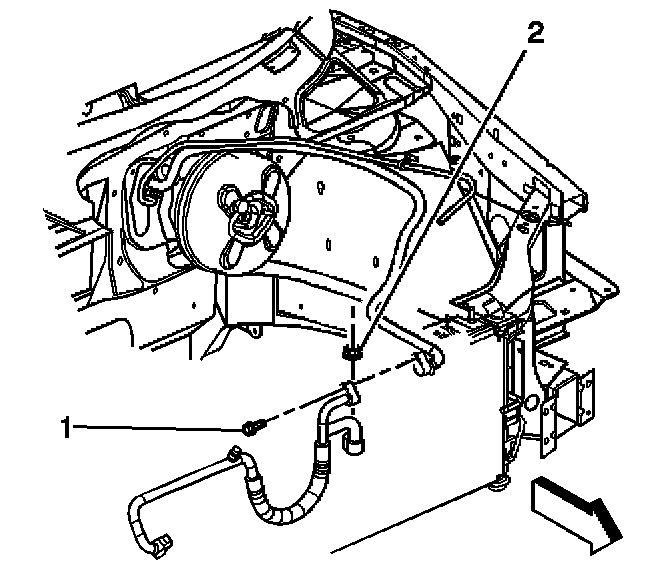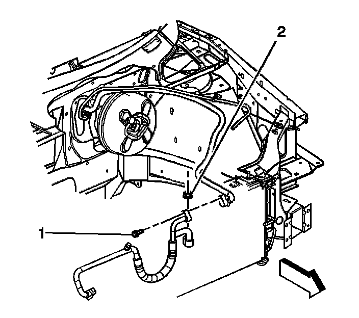 7. Remove the evaporator outlet tube to suction hose bolt (1).