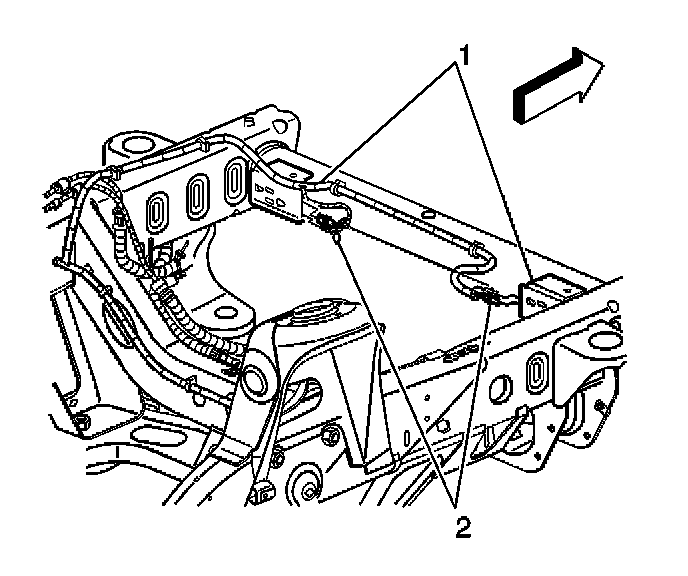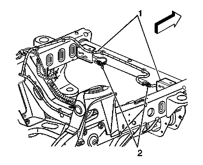 6. Remove the connector position assurance (CPA) from both front end sensor connectors (2) located on the frame crossmember (1).
