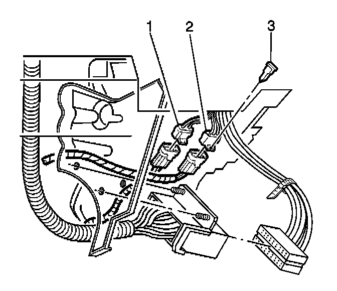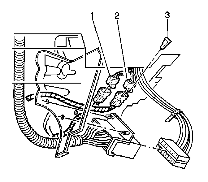 6. Remove the connector position assurance (CPA) (3) from the steering wheel module coil yellow 4-way connector (2) located at the base of the steering column.