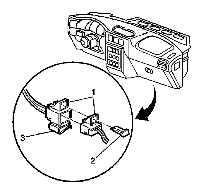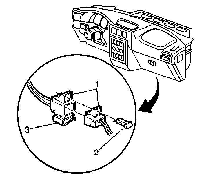 6. Remove the connector position assurance (CPA) (2) from the I/P module yellow 4-way connector (1) located behind the right side insulator panel.
