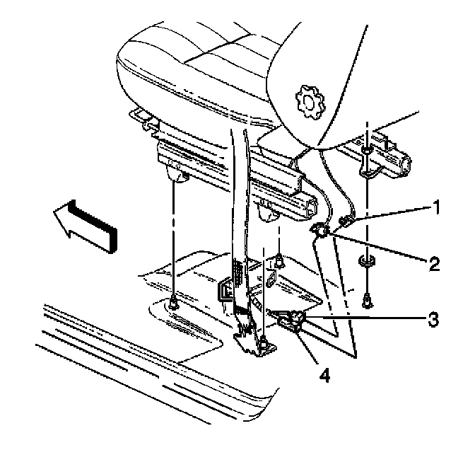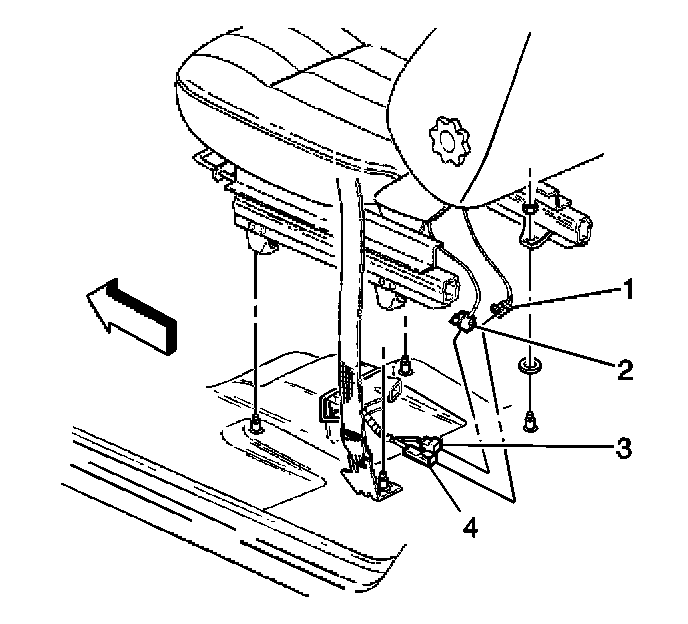 17. Remove the CPA from the seat belt pretensioner - RF yellow 2-way connector (3) located under the front passenger seat.