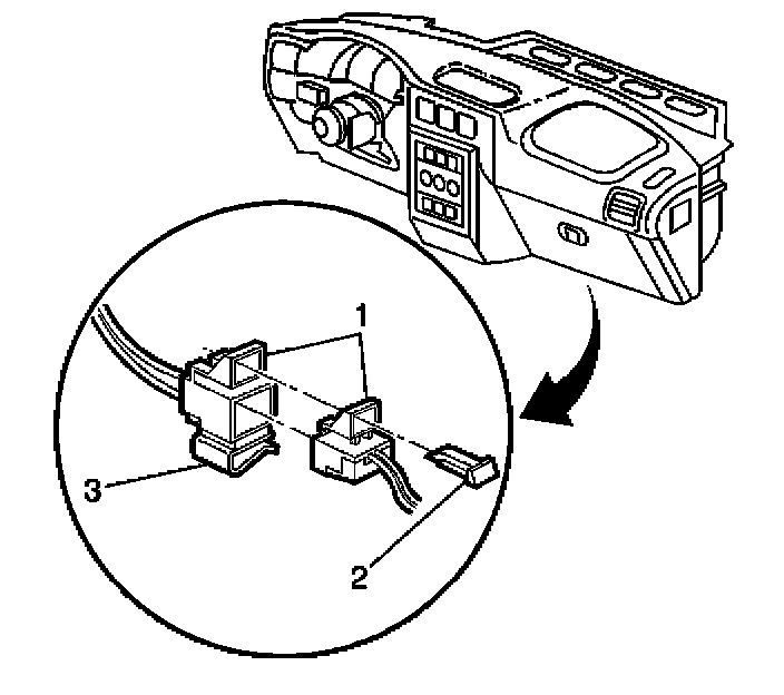 9. Remove the CPA (2) from the instrument panel (I/P) module yellow 4-way connector (1) located behind the right side insulator panel.