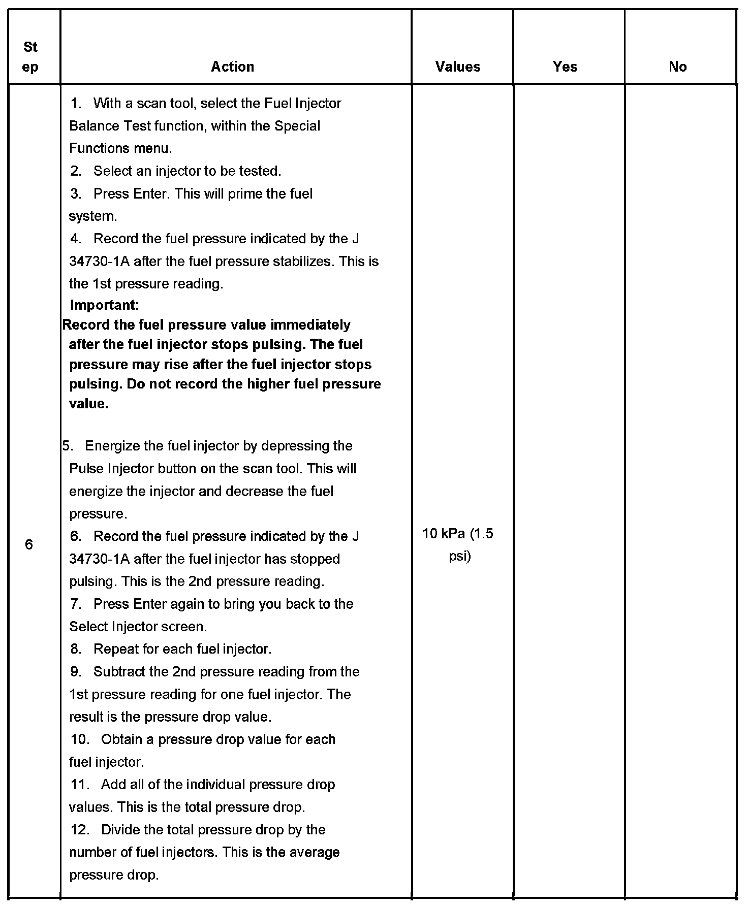 6. If the pressure drop value for each fuel injector is within 10 kPa (1.5 psi) of the average pressure drop value, the fuel injectors are flowing properly.