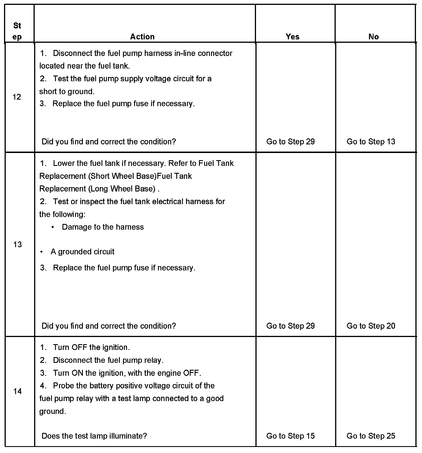 12. This tests for a grounded fuel pump supply voltage circuit. The fuel pump fuse supplies power to fuel pump. Disconnecting the fuel pump in-line harness connector isolates the fuel pump supply voltage circuit.