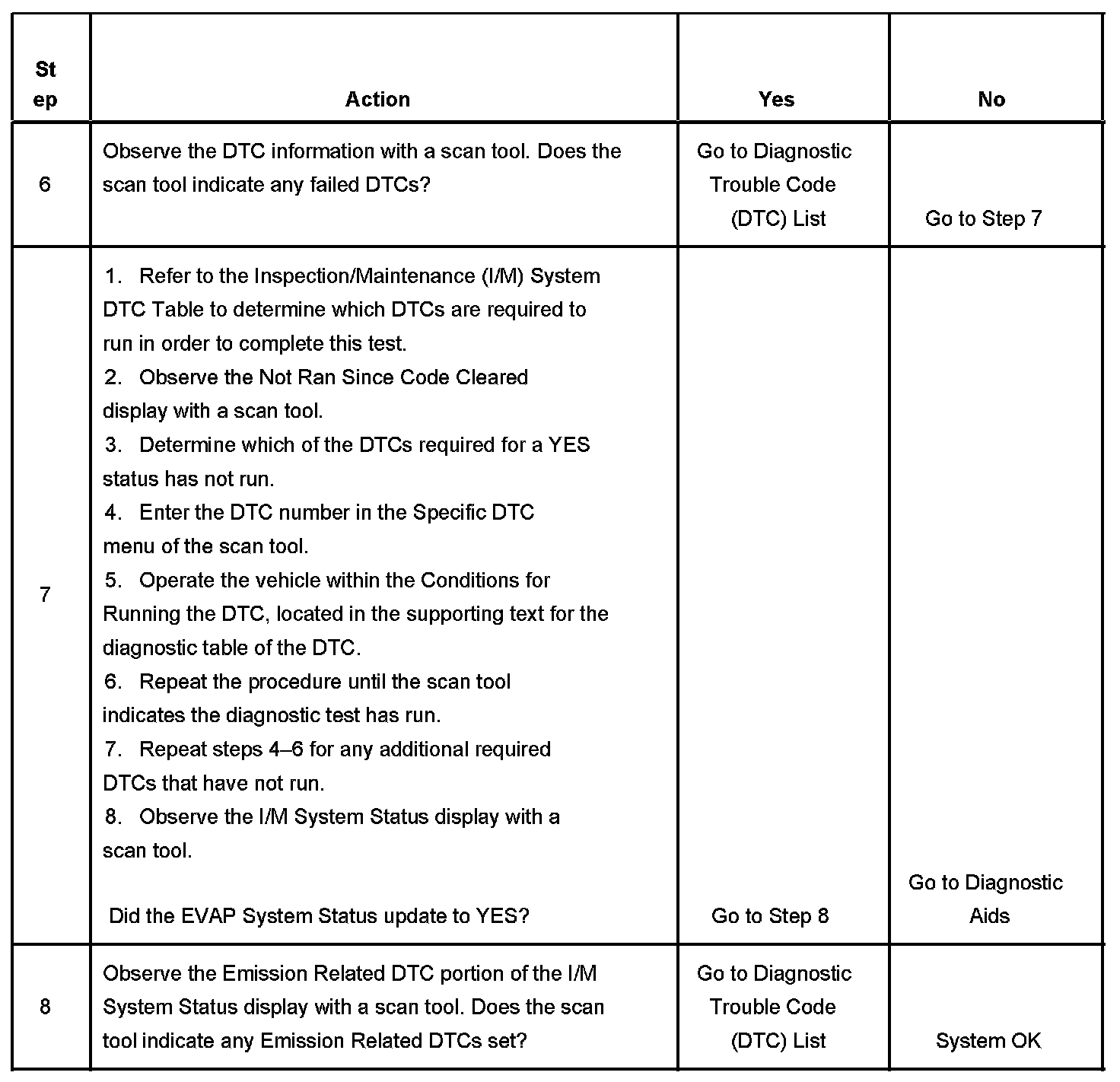 The purpose of this test is to satisfy the enable criteria necessary to execute inspection/maintenance (I/M) readiness diagnostics for the evaporative emission (EVAP) system. The test may be used to set the I/M System Status indicators to YES. The I/M System Status display on the scan tool indicates whether or not the control module has completed the required test. The required test is complete when either all of the DTCs comprising the test have run and passed, or when any one of the DTCs comprising the test has illuminated the malfunction indicator lamp (MIL). Once the test is complete, the I/M System Status display will indicate YES in the completed column. Performing a visual inspection prior to running the EVAP test may prevent having to repeat the test due to the fact that a failed or aborted test will require the vehicle to cool down in order to meet the enable criteria to run another test.
