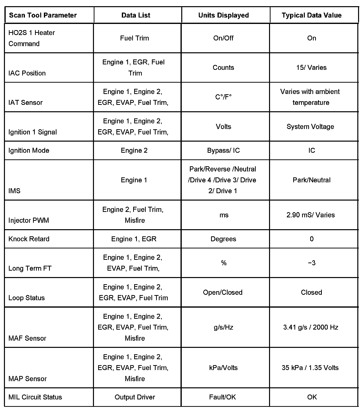- Engine Data 1 - Contains general information regarding fuel delivery, idle air control (IAC) position, heated oxygen sensor (HO2S 1), HO2S 2, and other basic engine operating conditions.