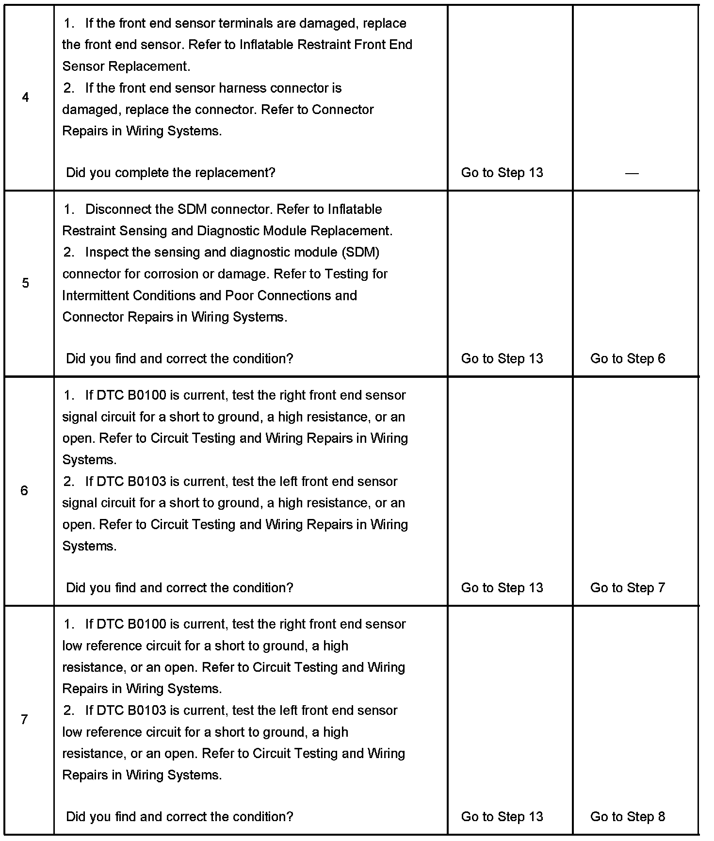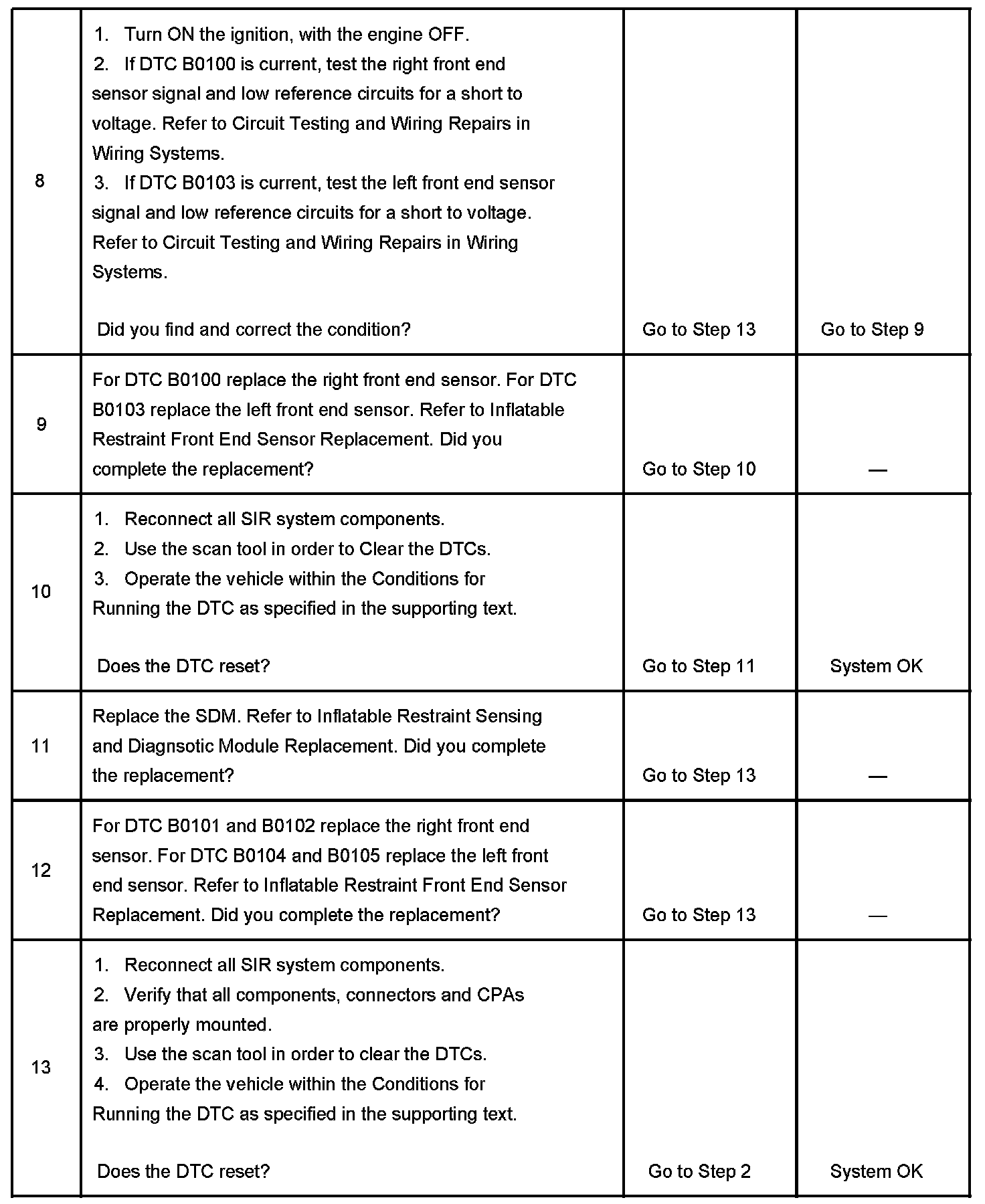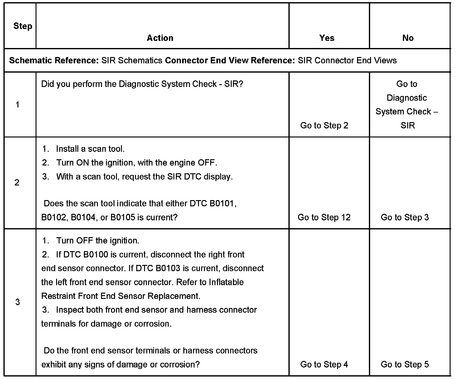 This bulletin is being issued to revise Steps 3, 6, 7, 8, 9 and 12 of DTC B0100, B0101, B0102, B0103, B0104 or B0105 in the SIR sub-section of the Service Manual. Please replace the current information in the Service Manual with the following information.