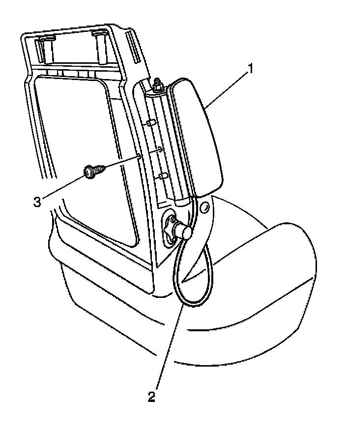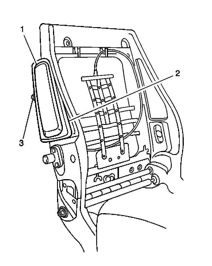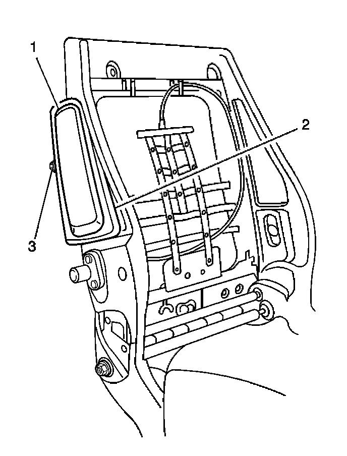 3. Install the plastic molding (2) that holds the air bag inflator module (1) to the passenger seat back frame.