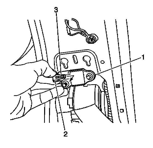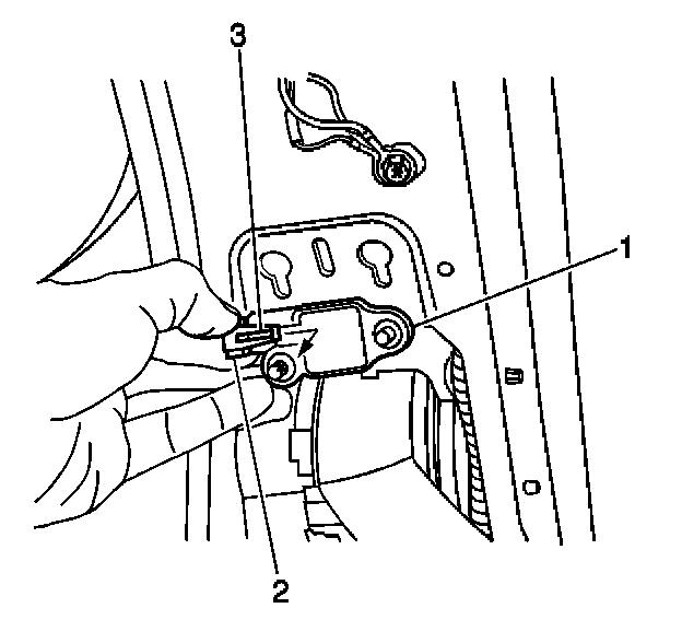 5. Remove the connector position assurance (CPA) (3) from the inflatable restraint side impact sensor yellow 2-way wiring harness connector (2).