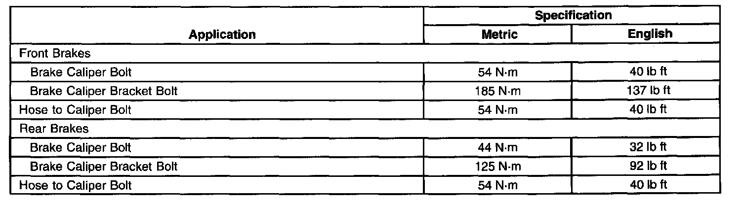 Disc Brake Fastener Tightening Specifications: