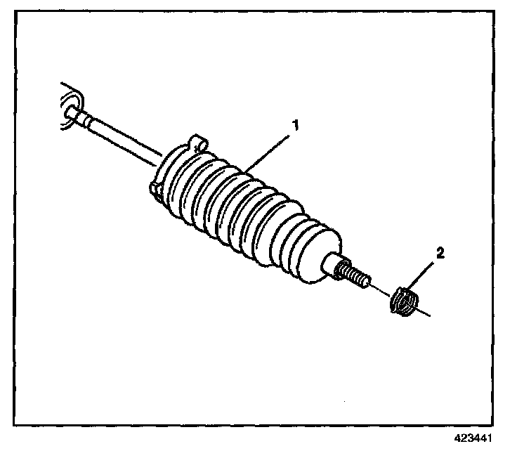 2. Prior to rack and pinion boot installation, apply grease to the inner tie rod assembly (2) and the rack and pinion gear assembly (1).