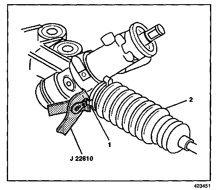 5. Install the boot clamp (1) on the rack and pinion boot (2) with J 22610.