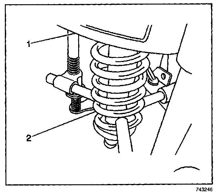 6. Loosen the compressor forcing screw (1) until the upper strut mount and coil spring (2) may be removed.
