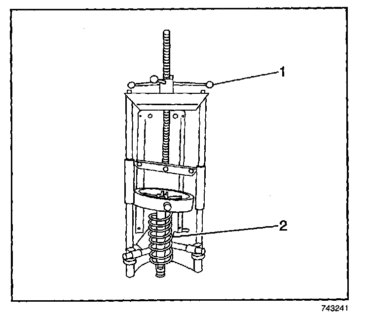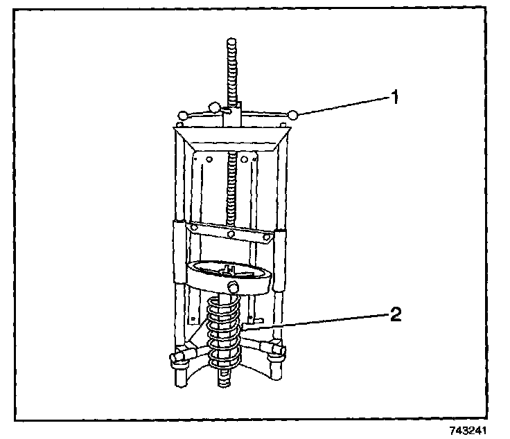 3. Turn the spring compressor forcing screw (1) until the coil spring (2) is compressed.