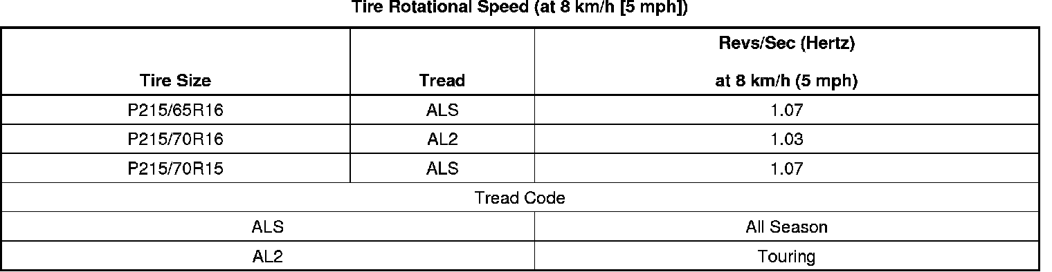 1. Determine the rotational speed of the tires in revolutions per second (RPS), or Hertz (Hz), at 8 km/h (5 mph), based on the size of the tires. Refer to the Tire Rotational Speed table.