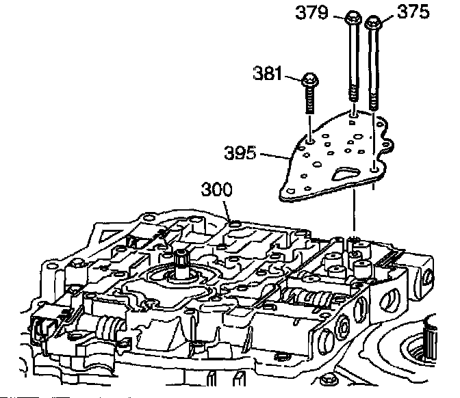 3. Remove the control valve body bolts (375, 379 and 381) that mount the fluid pressure manual valve position switch to the control valve body (300).