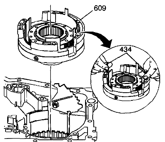 3. Using the bolts (434), lift the driven sprocket support assembly (609) into the case and align as shown. The top of the driven sprocket support assembly (609) should be flush with the case.