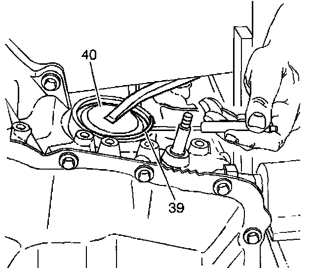 Reverse Servo Disassemble1. Use a long screwdriver in order to depress the reverse band servo cover (40) by prying against the transmission holding fixture.