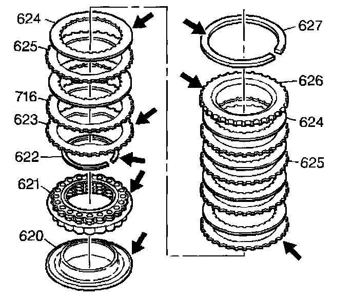 3. Inspect the steel plates (625) and the apply plate (716) of the second clutch for wear.