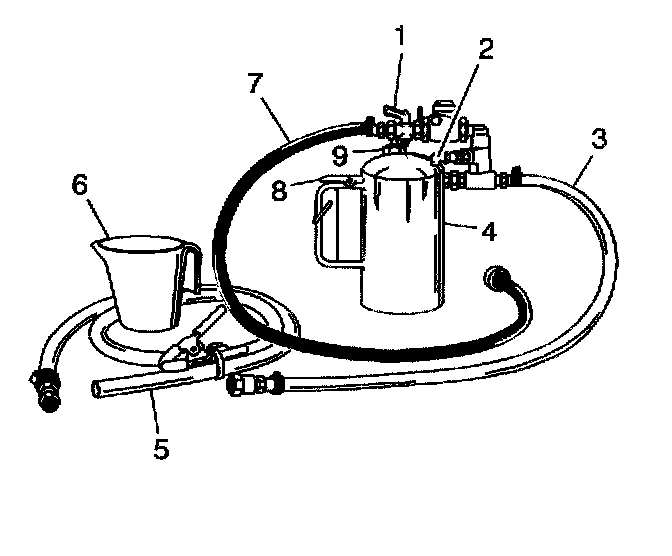 3. Install the fill cap (9) on the J 35944-A and pressurize the flusher tank (4) to 550 - 700 kPa (80 - 100 psi), using the shop air supply at the tank air valve (2).