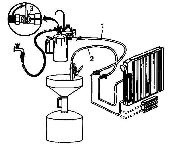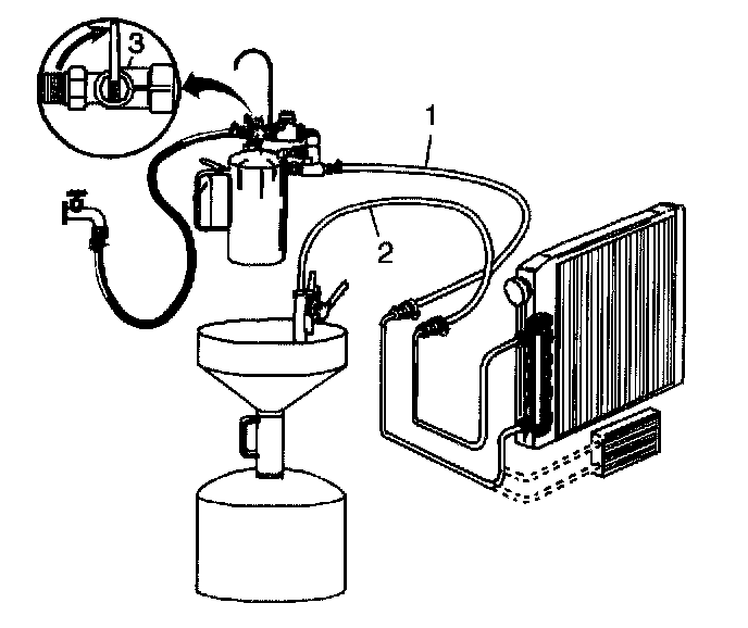 5. Turn the J 35944-A water supply valve (3) to the ON position and allow water to flow through the oil cooler and pipes for 10 seconds to remove any remaining transmission fluid. If water does not flow through the oil cooler and pipes, the cause of the blockage must be diagnosed and the plugged component must be repaired or replaced. Continue with the cooler flushing and flow check procedure once the blockage is corrected.