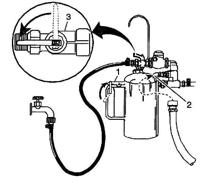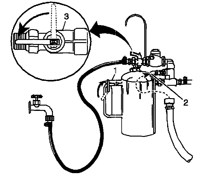 6. Turn the J 35944-A water supply valve (3) to the OFF position and clip the discharge hose onto a 19 liter (5 gallon) pail with a lid, to avoid splashback.