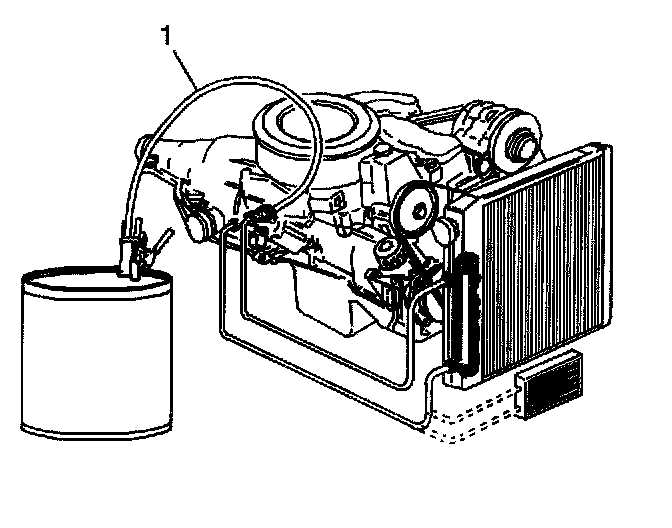 4. Start the engine with the transmission in PARK range and run for 30 seconds after fluid begins to flow from the discharge hose (1). A minimum of 1.9 L (2 quarts) must be discharged during this 30 second run time.