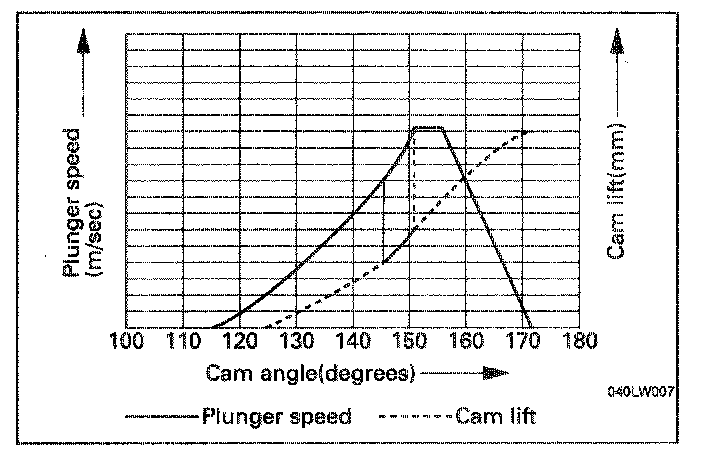 - The left hand figure shows plunger speed and cam lift in relation to cam angle. It can be seen from the graph that plunger speed increases together with cam lift.