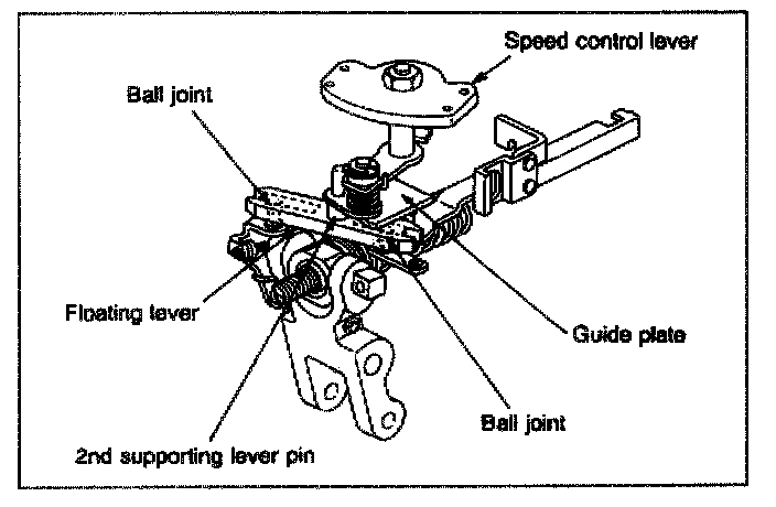 When the speed control lever is operated, the 2nd supporting lever's pin moves along the guide plate. The floating lever connected to the pin thus moves to change the ball joint fulcrum positions.