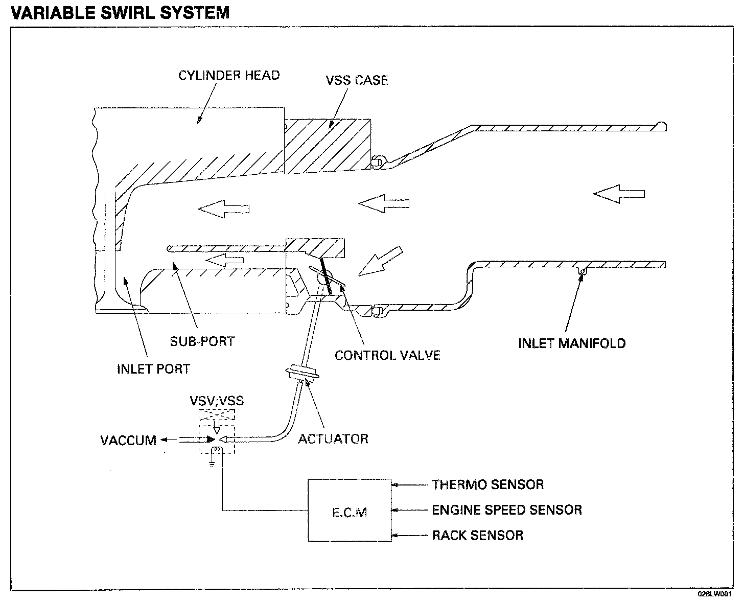 The Variable Swirl System (VSS) is designed to adjust the intensity of swirl by allowing or not allowing air to flow through a sub-port (or bypass) the runs in parallel with the intake port for each cylinder. The swirl intensifies when the is no air flow through the sub-port, and vice versa.