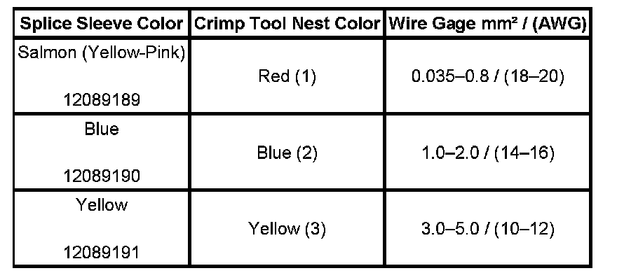 6. Select the proper duraseal splice sleeve according to the wire size. Refer to the above table at the beginning of the repair procedure for the color coding of the duraseal splice sleeves and the crimp tool nests.