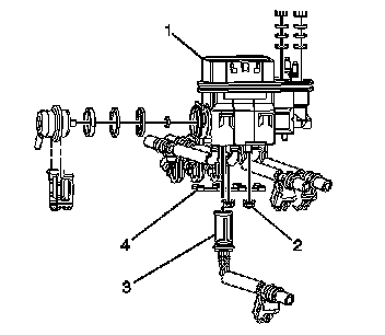 2. Install the fuel injector assembly (3) into the fuel meter body (1).