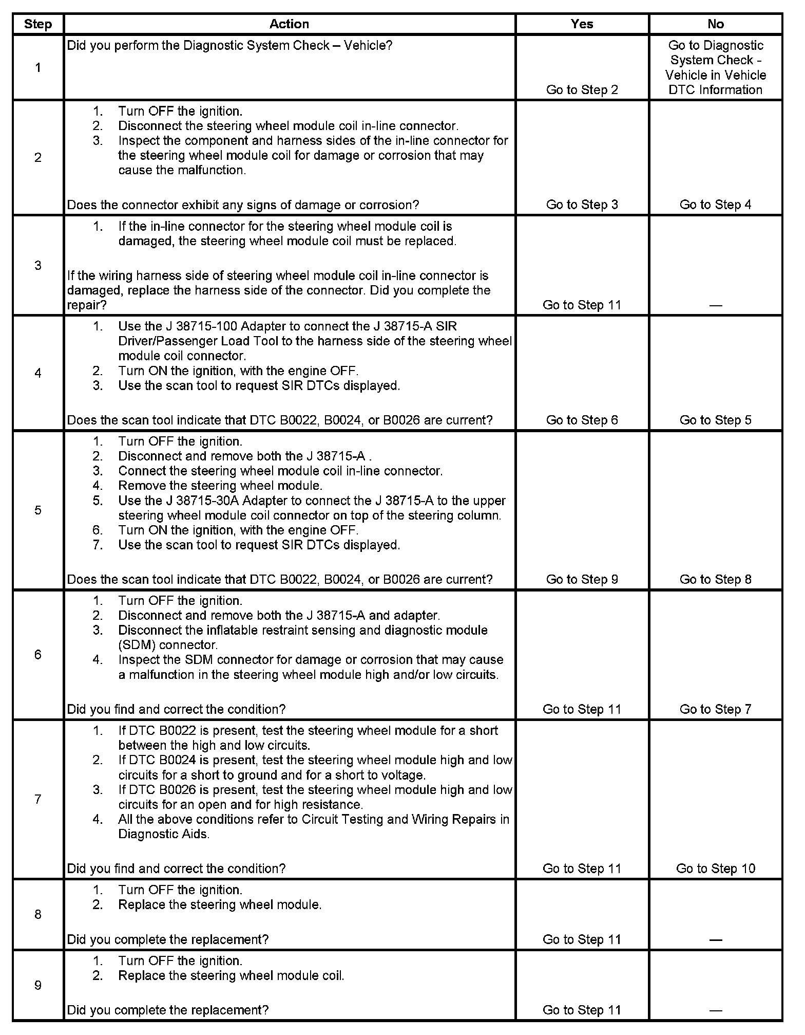 7. Tests to see what DTCs are present. If DTC B0022 is present, test the steering wheel module for a short between high and low circuits. If DTC B0024 is present, test the steering wheel module high and low circuits for an open and for high resistance. If DTC B0026 is present, test the steering wheel module high and low circuits for an open and for high resistance.