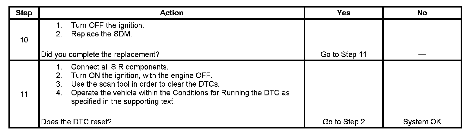The driver deployment loop consists of an inflatable restraint steering wheel module, the inflatable restraint steering wheel module coil, steering wheel module high and steering wheel module low circuits. There is a shorting bar used within the steering wheel module coil connector which will short together both steering wheel module high circuit and steering wheel module low circuit when the connector is disconnected, this will help to prevent unwanted deployment of the inflator module during servicing. During a frontal crash of sufficient force the inflatable restraint sensing and diagnostic module (SDM) will allow current to flow through the deployment loop in order to deploy the steering wheel module. The SDM performs continuous diagnostic tests on the deployment loops to check for proper circuit continuity and for shorts to ground or voltage. If a malfunction is detected, a diagnostic trouble code (DTC) will be stored in memory.